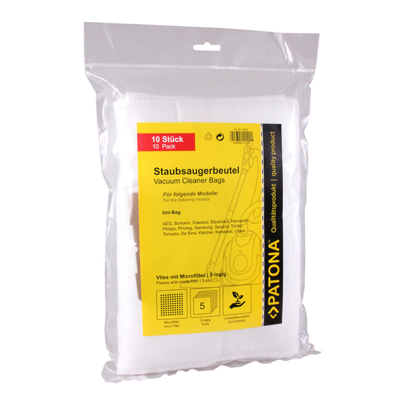 Zestaw 10 wymiennych toreb uniwersalnych do odkurzaczy AEG, Electrolux, Samsung, Melissa i innych marek, które pozwolą Ci zaoszczędzić cenny czas i pieniądze. Torbę wykonano z wielowarstwowego materiału z mikrofibry. Mikrofiltr zapewnia skuteczną filtrację wstępną i równomierne rozprowadzenie kurzu w worku, dzięki czemu przepływ powietrza jest stały aż do całkowitego zapełnienia worka.